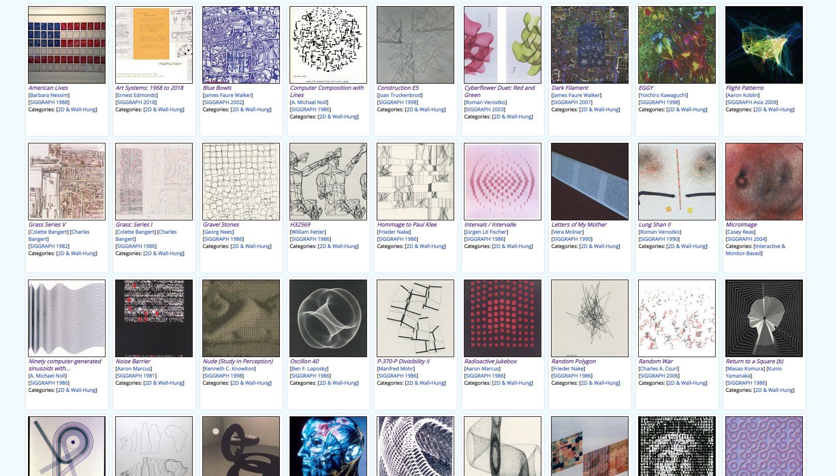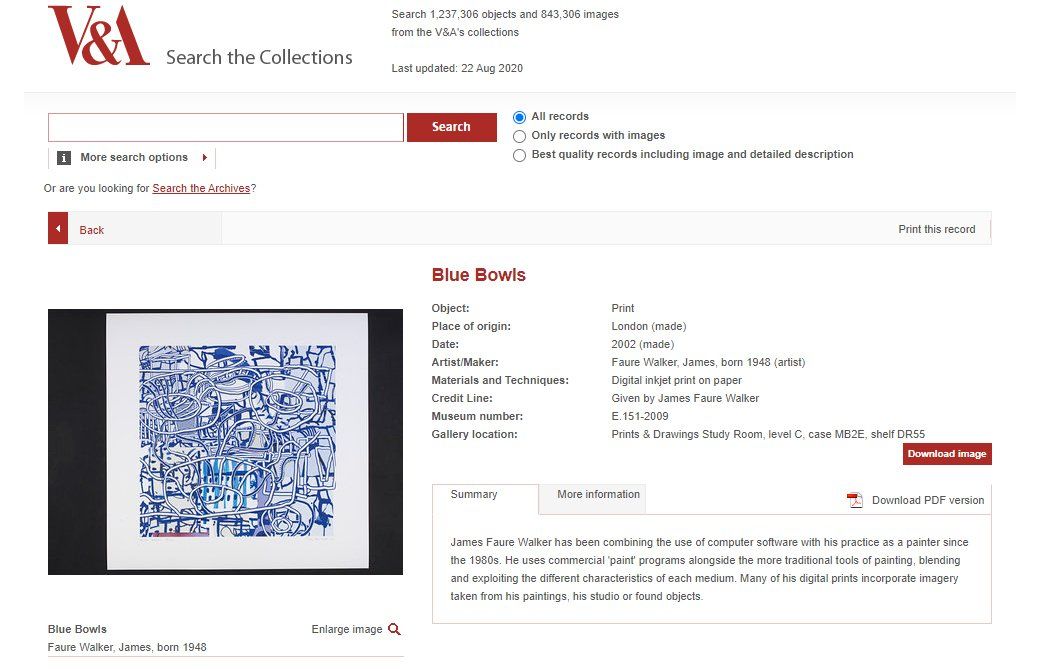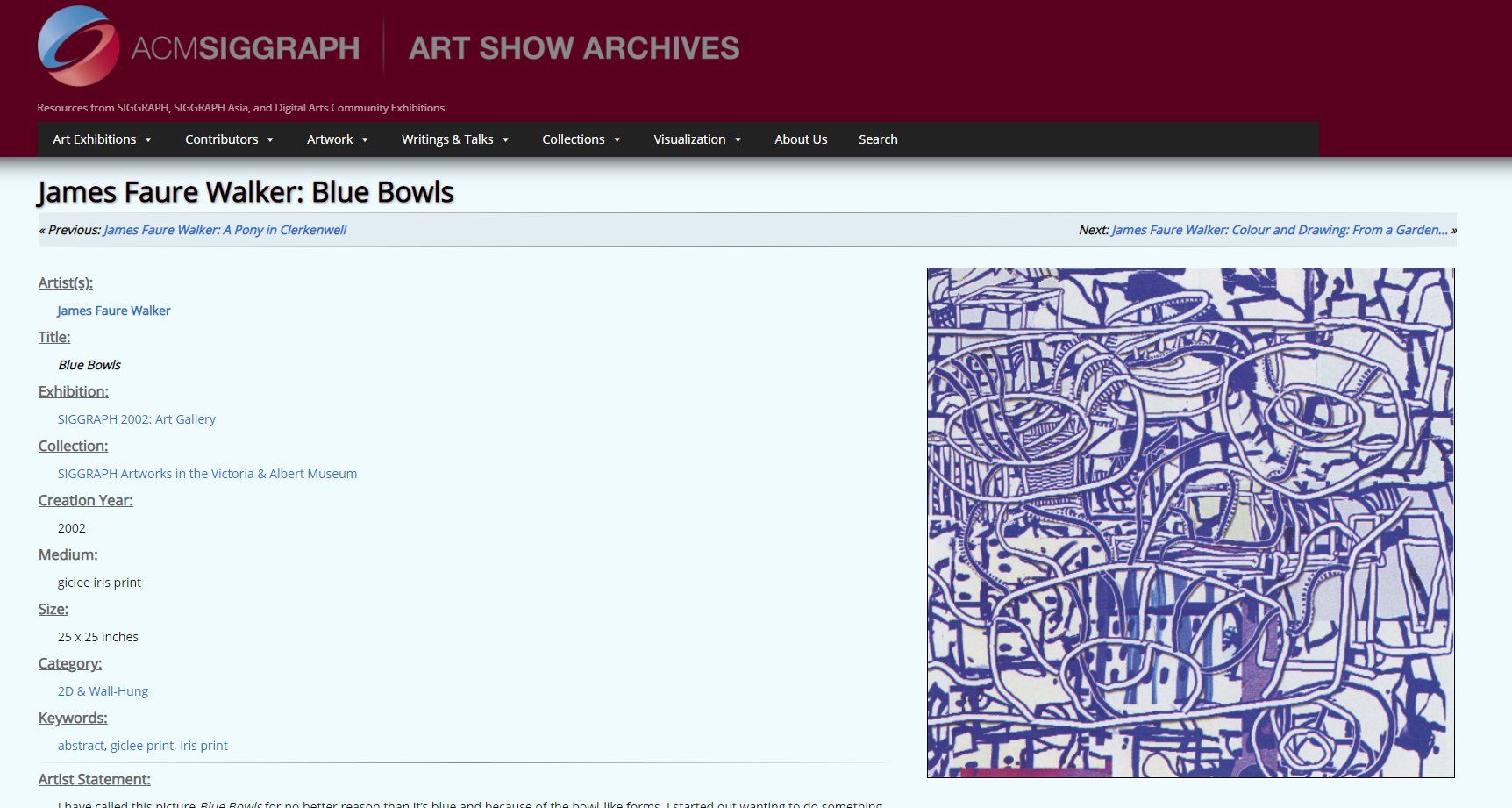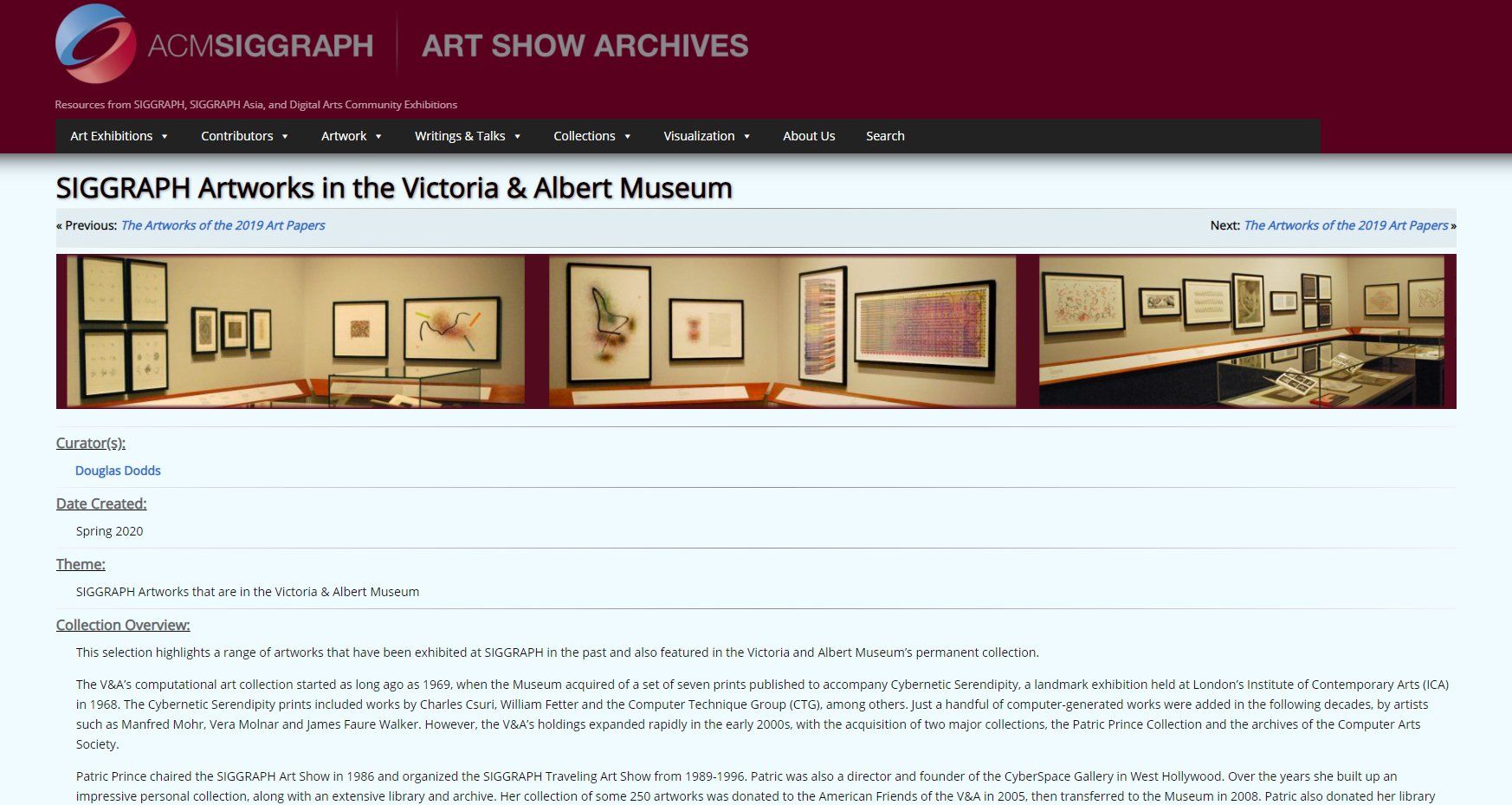 The SIGGRAPH Art Show Archives now include a curated collection highlighting artworks exhibited at SIGGRAPH that also feature in the V&A's permanent collection . The selection includes some 40 artworks by around 30 different artists.